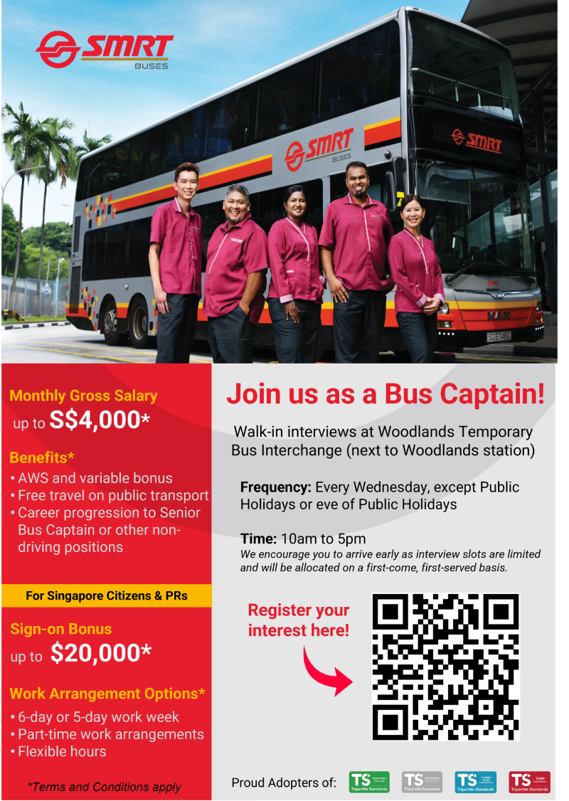 If you possess a valid Singapore Class 3A/3/4/4A/5 driving license and have at least one year driving experience, come on down for an interview to become a bus captain with SMRT!